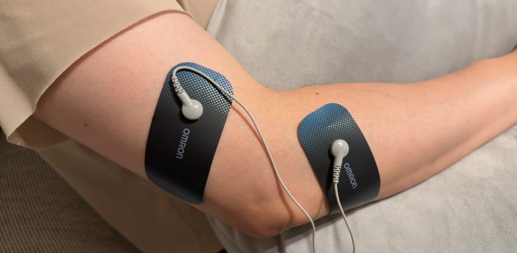 マイクロカレントモードでは、患部の関節や治療したい部位を挟み込むように貼り付けることになります。