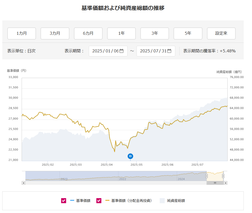 年初から7月末までのオルカン基準価額推移については、次のようになっています。