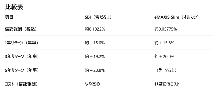 リターンやコストを比較するとこんな感じです。