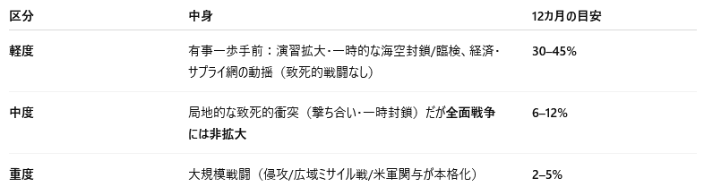 ※情勢連動で上振れ下振れあり(例)米中関係改善→全体5–10pt低下、台湾海峡での恒常的封鎖リハーサル増→中度・重度を数pt押し上げ